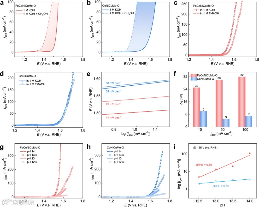 图4g-i:FeCoNiCuMo-O的OER活性随着pH值增加而显著提升,LOM路径得到优化。