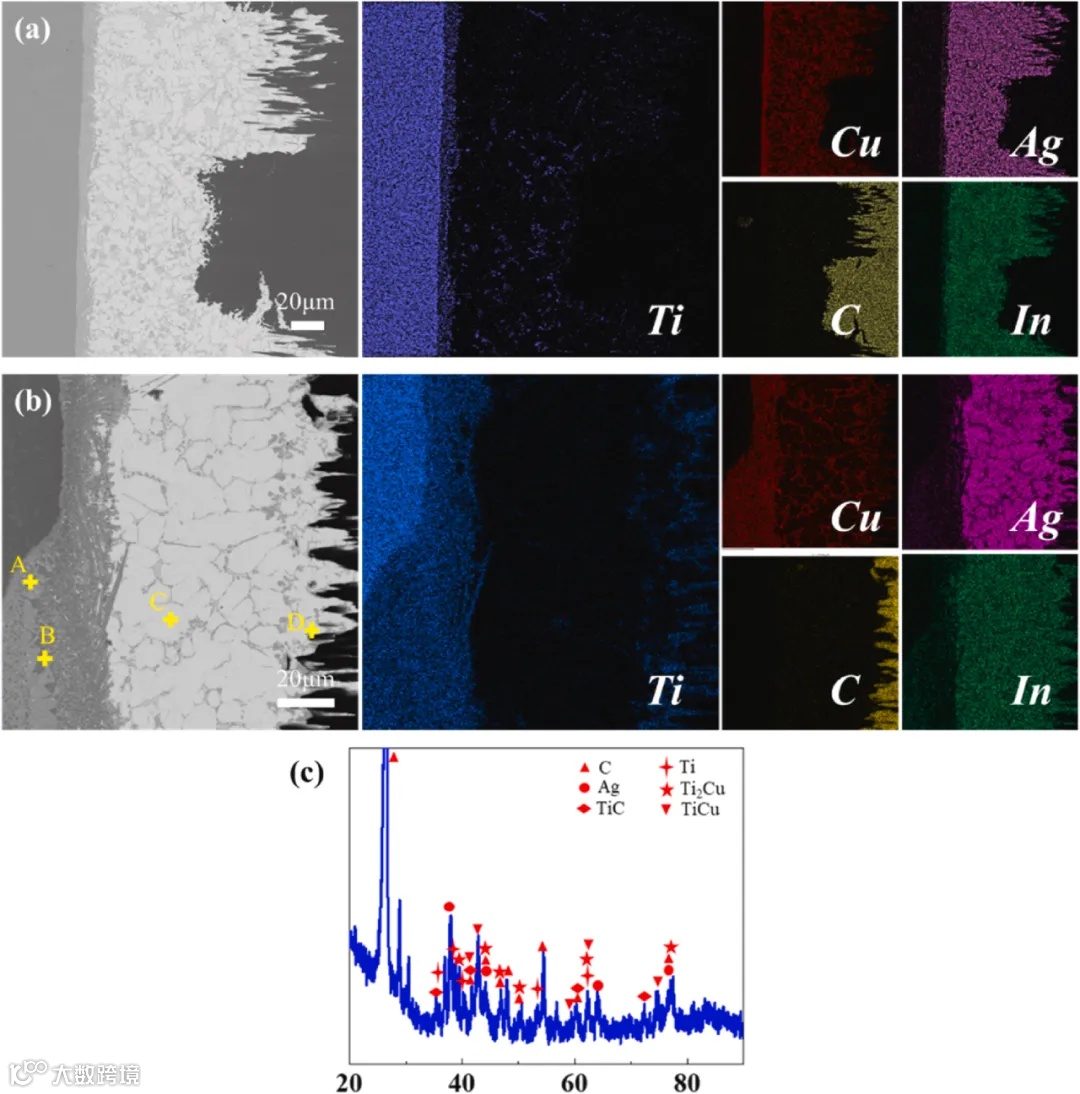 图6(a) 和 (b) 展示了在50 A和60 A电流下C/C-TC4接头的微观结构和元素分布。6(c) 钎焊接头的X射线衍射(XRD)图谱,用于分析接头区域的相组成。