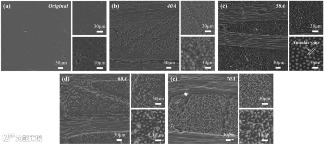 图2展示了C/C复合材料在不同电流(0 A, 40 A, 50 A, 60 A, 70 A)下进行表面选择性氧化后的表面形貌。
