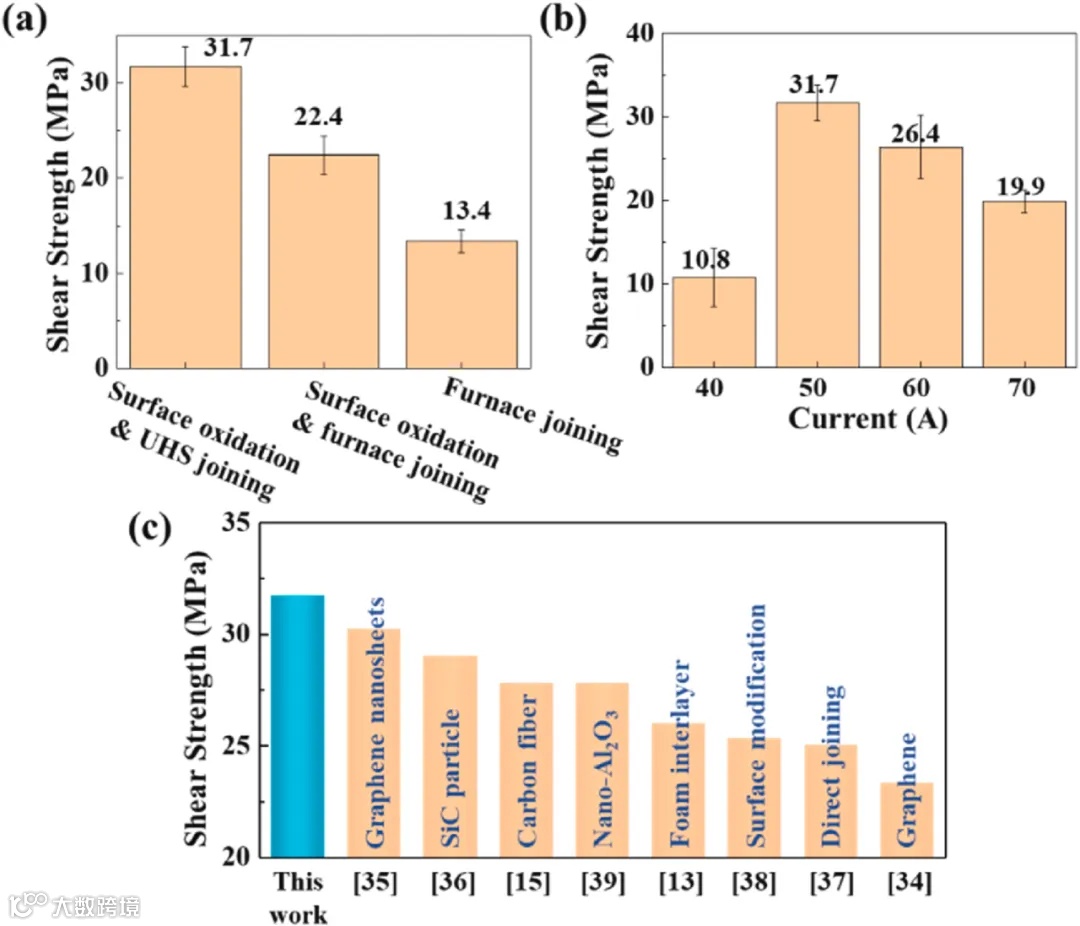 图8展示了不同连接方法下C/C-TC4接头的剪切强度对比。结果表明,采用UHS技术连接的接头剪切强度最高,达到了31.7 MPa,是传统连接方法的2.4倍。