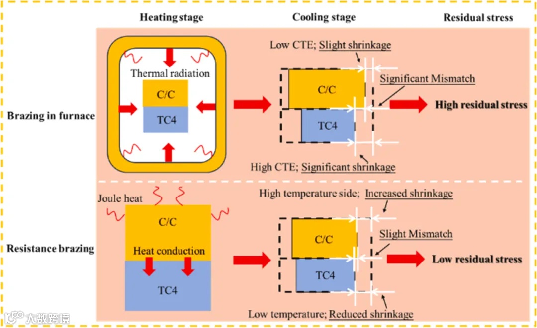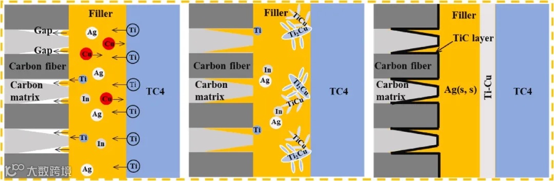 图12阐述了UHS连接过程中的强化机制。由于TC4金属的温度显著低于C/C复合材料,其热膨胀受到限制,而C/C复合材料的高温导致较大的收缩,从而有效减少了由于CTE不匹配引起的残余应力。