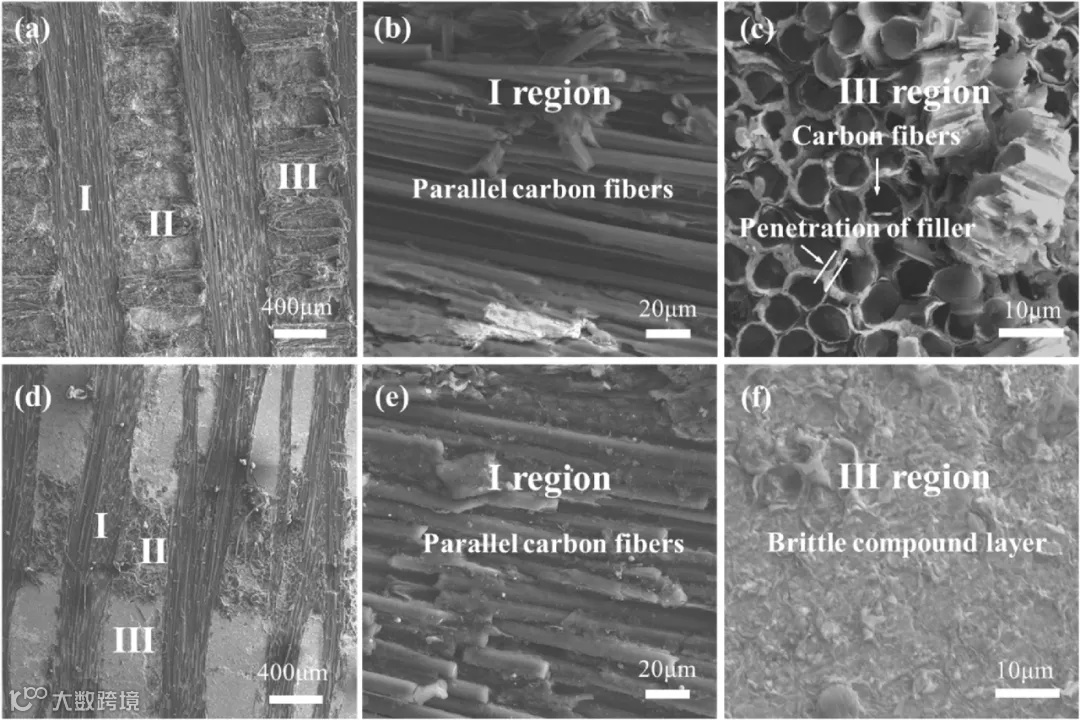 图9展示了C/C-TC4接头在TC4侧的断裂形貌,其中(a–c)为经过表面选择性氧化处理的接头,而(d–f)为未经此处理的接头,对比显示了表面处理对断裂特性的影响。