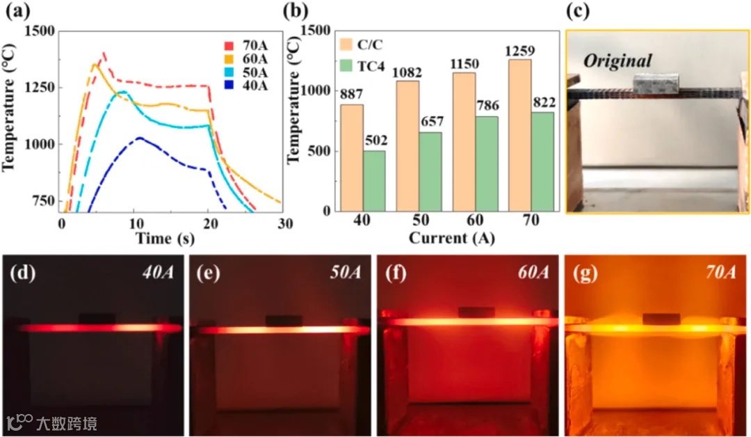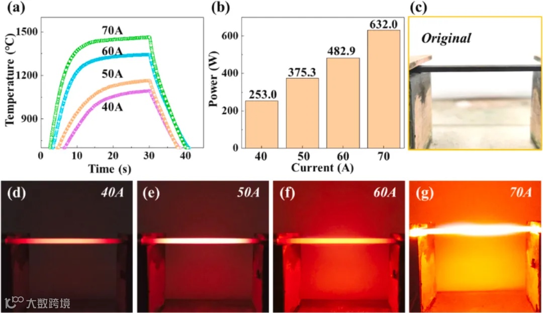 图3(a) 展示了在选择性氧化过程中温度随时间的变化曲线。3(b) 显示了在不同电流下进行表面选择性氧化所需的加热功率。3(c-g) 可能是在不同电流下进行超快氧化过程的数字照片,展示了C/C复合材料在氧化过程中的实际外观,如发出的黄光等。