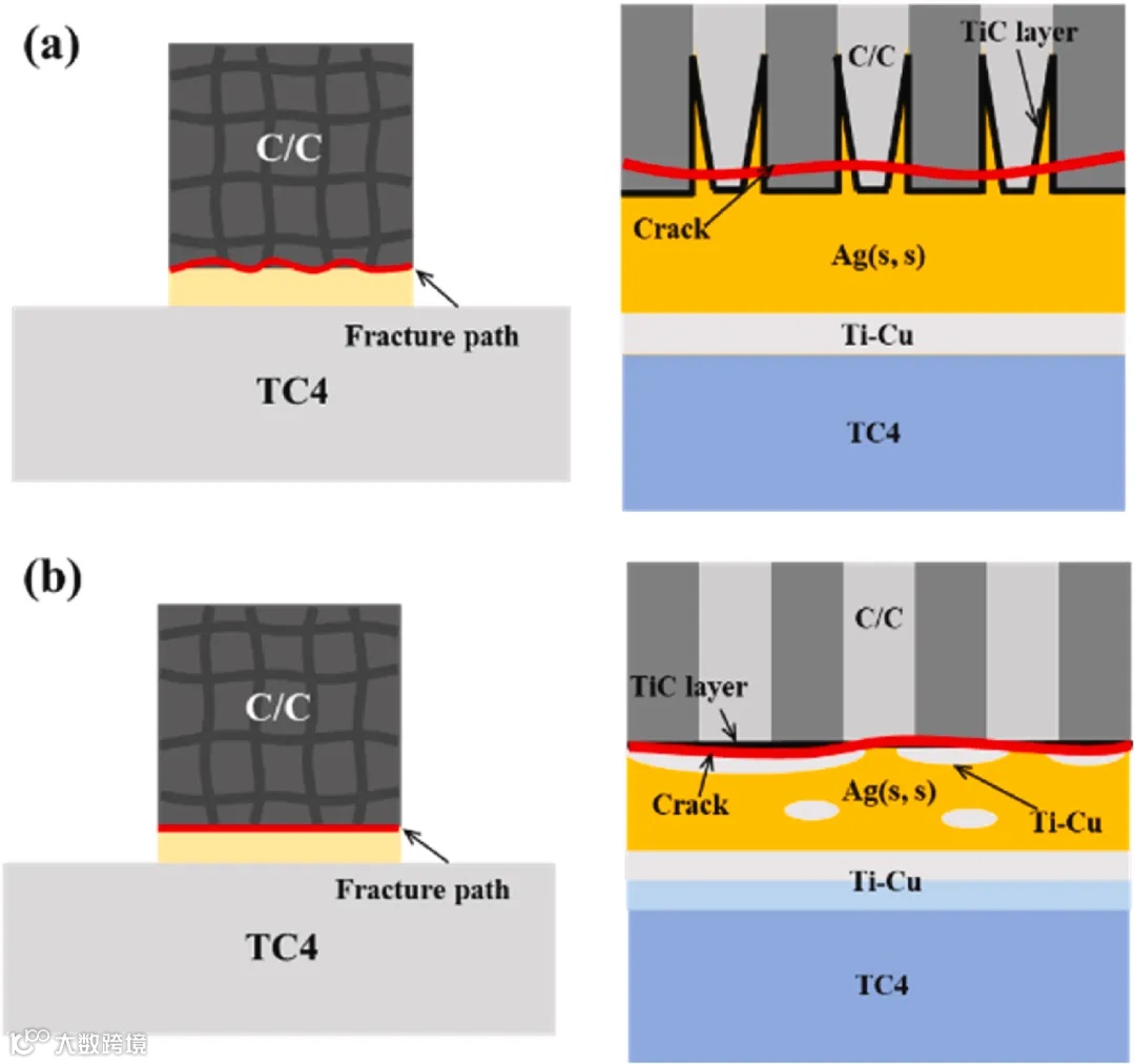 图10(a) 和 (b) 可能展示了C/C-TC4接头的断裂机制,其中(a)为采用表面选择性氧化的UHS连接方法,而(b)为在真空炉中直接连接而不进行表面选择性氧化。