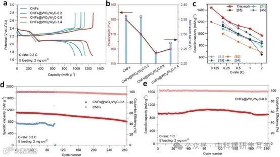 在Li-S电池的电化学性能方面,组装了使用LiPSs catholyte作为活性材料的电池,并测试了不同宿主的电化学性能。恒流充放电(GCD)曲线显示了典型的两个充电平台和两个放电平台(图5a)。特别是,CNFs@WOx/W2C-0.8的电池在0.1 C时硫利用率高达86.1%,在0.2 C时比其它三个宿主的电池具有更高的比容量(图5a)。此外,CNFs@WOx/W2C-0.8的电池在不同电流密度下实现了高可逆容量,并且在2 C时提供了935.0 mAh g^-1的容量,远高于其它电池(图5c)。在0.5 C和1 C的电流密度下,电池展现了优异的循环稳定性和低容量衰减率(图5d, e)。