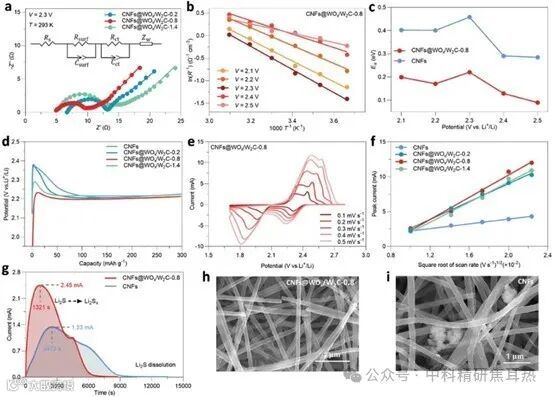 在Li-S电池的动力学分析中,通过电化学阻抗谱(EIS)测量进一步验证了CNFs@WOx/W2C-0.8增强的电催化活性。Nyquist图显示了CNFs@WOx/W2C-0.8具有最小的电荷转移电阻(Rct),表明了最快的电荷转移动力学(图4a)。通过Arrhenius方程确定了不同温度下充电过程中的活化能(Ea)(图4b, c)。此外,还探讨了CNFs@WOx/W2C基材料对Li2S氧化的电催化能力,并使用恒电位实验表征了不同阴极上预沉积Li2S的溶解行为(图4d-g)。