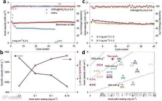 在高硫负载下,进一步验证了CNFs@WOx/W2C-0.8在Li-S电池中的潜力。在0.2 C下测试了4.0 mg cm^-2的硫负载,并在70个周期后实现了高容量保持率和平均库仑效率(图6a)。随着硫负载的增加,电池在0.1 C下实现了更高的初始面容量(图6b)。在6.1 mg cm^-2的硫负载下,经过45个周期后,电池提供了5.8 mAh cm^-2的面容量,并保持了97.0%的初始面容量,对应于每周期0.067%的容量衰减率(图6c)。与最近报道的具有电催化剂的Li-S电池相比,本工作中CNFs@WOx/W2C-0.8的电池在高面容量下展现了优异的面容量(图6d)。这些出色的性能展示了CNFs@WOx/W2C-0.8作为电催化宿主实现高能量密度Li-S电池的巨大潜力。
