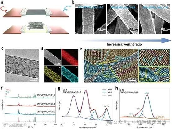 在合成和结构表征方面,采用了超快焦耳加热技术来合成由自由悬挂的CNFs支撑的WOx/W2C纳米粒子(图2a)。通过电沉积法,首先在CNFs上形成(H2W12Ox)·H2O,作为后续焦耳加热过程中WOx/W2C形成的前驱体。通过调节电沉积过程中加载在CNFs上的前驱体数量,成功制备了密集且均匀分散的异质结构WOx/W2C纳米粒子。扫描电子显微镜(SEM)图像显示了CNFs@WOx/W2C-0.8纳米粒子在CNFs上的密集分布(图2b)。透射电子显微镜(TEM)图像和高角环形暗场扫描透射电子显微镜(HAADF-STEM)图像以及相应的能谱(EDS)映射进一步研究了CNFs@WOx/W2C-0.8的元素分布(图2c, d)。高分辨透射电子显微镜(HRTEM)用于进一步识别微观结构相信息,揭示了异质结构CNFs@WOx/W2C-0.8的特征(图2e)。X射线衍射(XRD)和X射线光电子能谱(XPS)用于定量分析不同组成相的演变(图2f, g)。