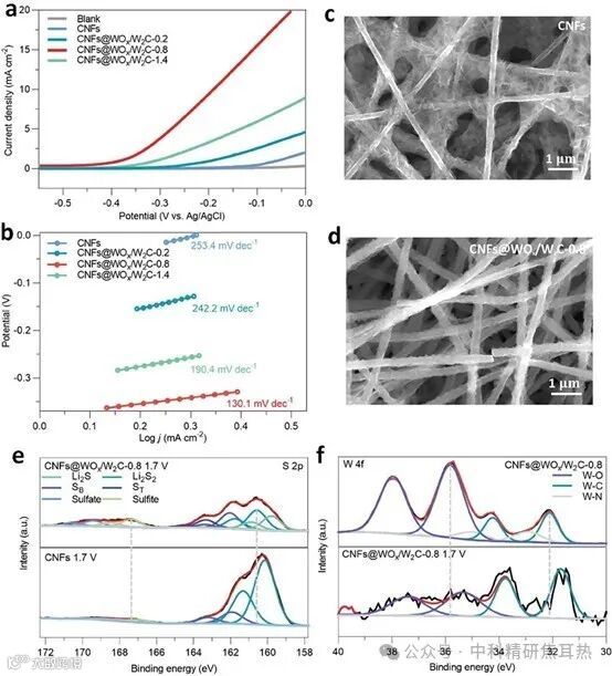 在电催化活性方面,通过线性扫描伏安法(LSV)测量,实验性地探索了CNFs@WOx/W2C基材料对Li2S氧化的电催化行为。CNFs@WOx/W2C-0.8的LSV曲线显示出比其他材料更低的起始电位,表明其具有改善的电催化活性(图3a, b)。通过循环伏安法(CV)曲线和扫描电镜(SEM)图像,进一步验证了CNFs@WOx/W2C-0.8加速和调控Li2S沉积的能力(图3c, d)。紫外光电子能谱(XPS)用于评估W2C和WO3的功函数,以评估电子转移的活化能(图S13,支持信息)。XPS还用于阐明LixS纳米粒子与CNFs@WOx/W2C-0.8之间的相互作用(图3e, f)。