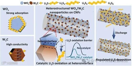 2024年2月,新南威尔士大学王大伟团队在《Small: nano micro》上发表了题为“Heterostructured WOx/W2C Nanocatalyst for Li2S Oxidation in Lithium–Sulfur Batteries with High-Areal-Capacity”的论文。本研究提出了一种新型的异质结构纳米催化剂WOx/W2C,通过超快焦耳加热技术合成,旨在解决锂硫(Li-S)电池中的关键挑战。Li-S电池因其高理论能量密度和硫的成本效率而被视为下一代电池技术的有力候选者。然而,缓慢的反应动力学、锂硫化物(Li2S)的无控制生长以及Li2S氧化过程中的高能垒,导致了低硫利用率和有限的循环寿命。尤其是在高电流密度和高硫负载下,这些问题变得更加严重。本研究所合成的WOx/W2C纳米催化剂,通过其异质界面显著提升了Li2S氧化的电催化活性,并实现了Li2S的均匀沉积控制。这些密集分布的纳米粒子为Li2S提供了丰富的结合位点,连续的异质界面有利于高效的吸附作用和电荷转移,从而降低了Li2S去锂化的活化能。这些特性使得Li-S电池能够实现高倍率性能和高面容量。本研究为在实际电池条件下Li2S氧化的有效催化剂设计提供了深入见解。