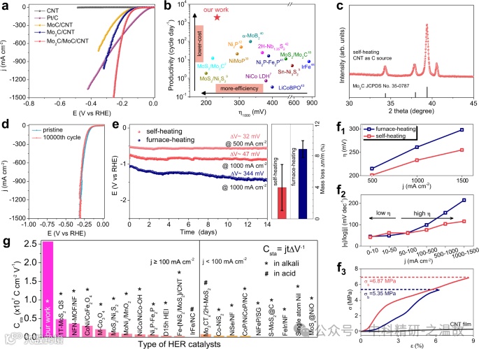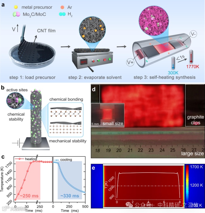 图1展示了利用焦耳自加热技术制备Mo2C/MoC/CNT催化剂的过程。该方法通过在碳纳米管薄膜上施加电压,实现超快速加热,并在纳秒级别的时间内完成纳米颗粒的合成。这一创新工艺极大提高了催化剂的活性与稳定性,有望解决大规模制氢过程中催化剂难以长时间稳定工作的难题。