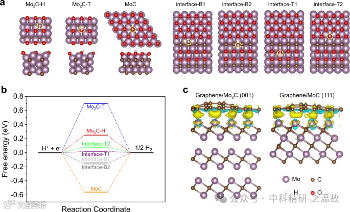 图5通过DFT计算揭示了Mo2C/MoC异质界面的独特优势。研究表明,Mo2C/MoC界面能够提供丰富的氢吸附活性位点,ΔGH接近理想值,表明其在氢气演化反应中的优越性。这一发现为理解该催化剂的高效稳定性提供了理论支持。