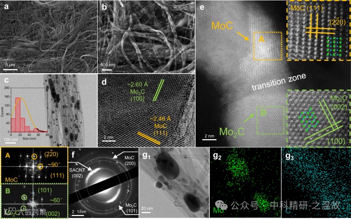 图2和图3展示了该催化剂的多种结构表征手段,从拉曼光谱、XRD图谱到HRTEM图像,详细呈现了Mo2C/MoC异质界面和碳纳米管之间的键合情况。这种键合显著提高了催化剂的机械强度和电化学性能,确保其在高电流密度下表现出色。