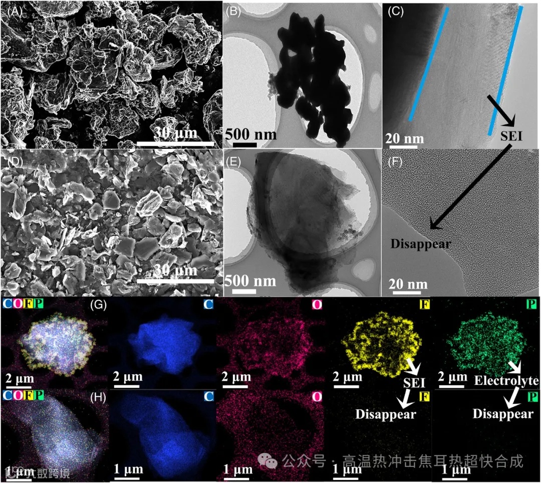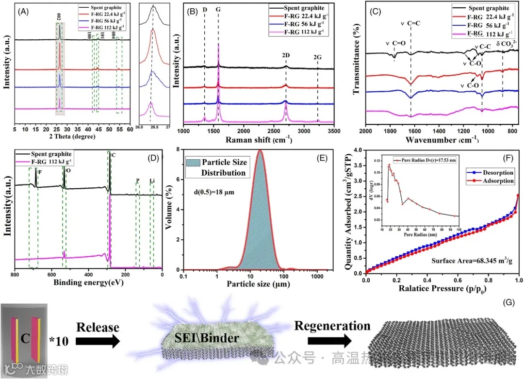 图2通过扫描电镜(SEM)和透射电镜(TEM)图像,直观地展示了废旧石墨和经过FJH处理后的再生石墨(F-RG)的形貌变化。可以看出,FJH处理显著去除了石墨表面的粘合剂和SEI层,并且促进了石墨材料的剥离,形成了更薄的石墨片层,这有利于提高材料的电导率和电化学性能。