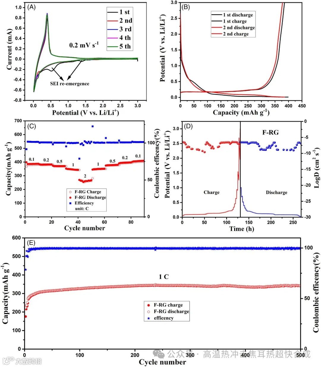 图4展示了F-RG作为锂离子电池负极材料的电化学性能测试结果。从循环伏安(CV)曲线、恒流充放电(GCD)曲线、不同电流密度下的倍率性能、以及电化学阻抗谱(EIS)和原位电位间歇滴定技术(GITT)结果来看,F-RG展现出了优异的电化学性能,包括高比容量、良好的倍率性能和稳定的循环性能。