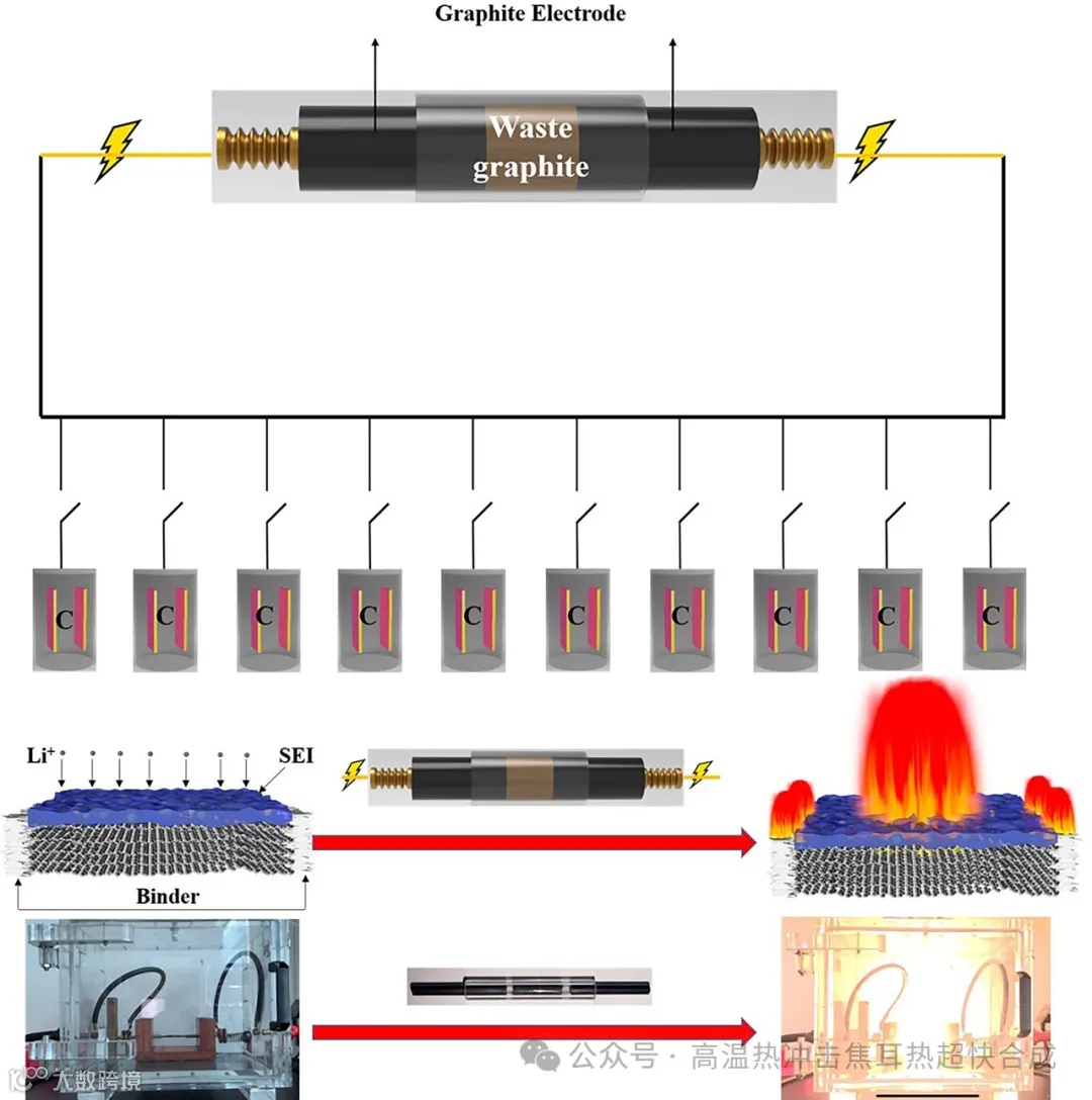 锂离子电池(LIBs)因其高能量密度和长寿命,已成为消费电子和电动汽车(EVs)的主要电源,预计到2030年全球电池储能需求将增至600 GW。然而,随着LIBs寿命终结,未来十年内将有大量废旧电池需要回收处理。尤其是石墨负极材料,由于其高电导率和低工作电压,几乎主导了整个负极市场。面对每年预计超过18万吨的废旧石墨产生量,开发一种低成本、高效的回收技术显得尤为迫切。传统的回收方法存在去除粘合剂和SEI层困难、电化学性能恢复缓慢等问题。闪蒸焦耳加热(FJH)技术以其能在毫秒级时间内达到3000 K以上高温的能力,为快速转化前体材料提供了一种新颖的高温合成技术,有望实现废旧石墨的大规模有效回收。