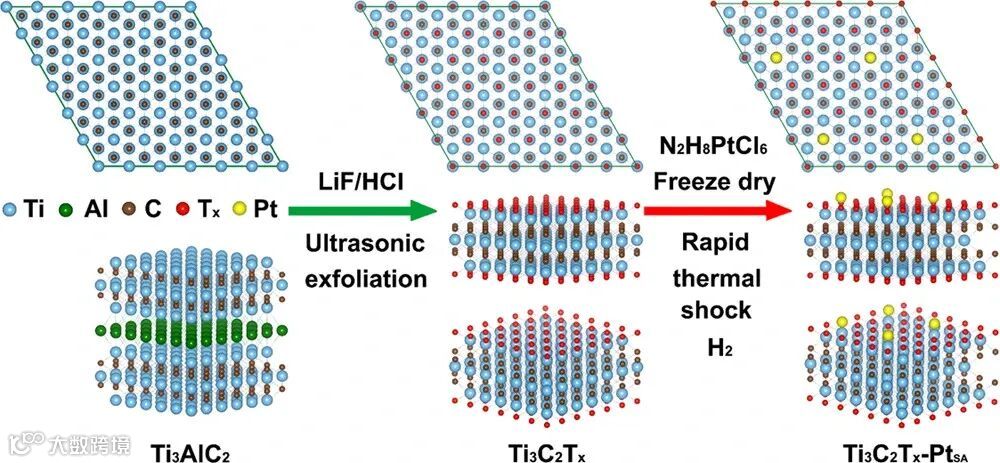 该图展示了Ti₃C₂Tₓ-PtSA的制备过程。研究采用快速热冲击技术,通过高温退火产生氧空位,利用Pt-Ti键牢固捕获Pt单原子。高角环形暗场扫描透射电镜(HAADF-STEM)和密度泛函理论(DFT)计算验证了单原子铂的成功锚定及其催化机制。