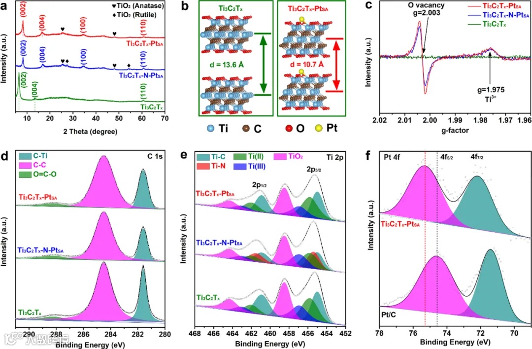 X射线衍射(XRD)结果显示,快速热冲击处理后,Ti₃C₂Tₓ仍保持二维特性。X射线光电子能谱(XPS)证实Pt为正价,电子顺磁共振(EPR)光谱进一步确认了氧空位的存在。这些结果表明,单原子铂锚定未改变材料基本结构。