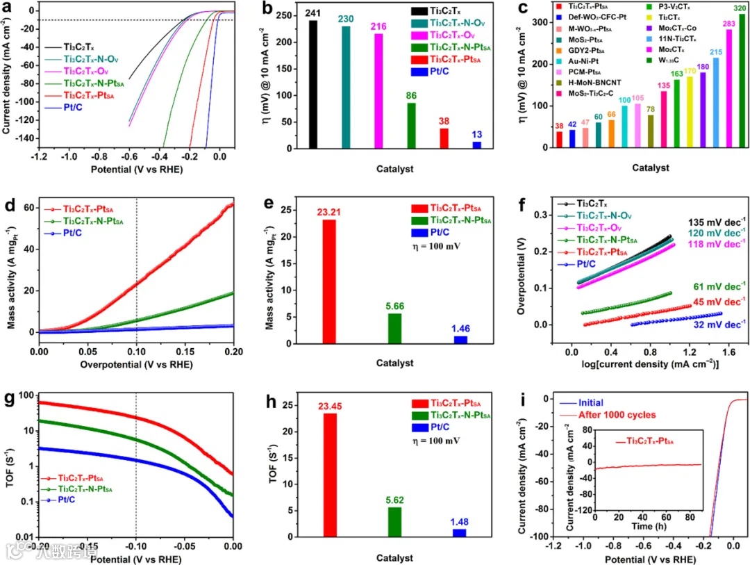 线性扫描伏安曲线(LSV)显示,Ti₃C₂Tₓ-PtSA在0.5 M H₂SO₄中的HER活性优于其他催化剂,Tafel斜率为45 mV dec⁻¹,与商业Pt/C(32 mV dec⁻¹)接近。