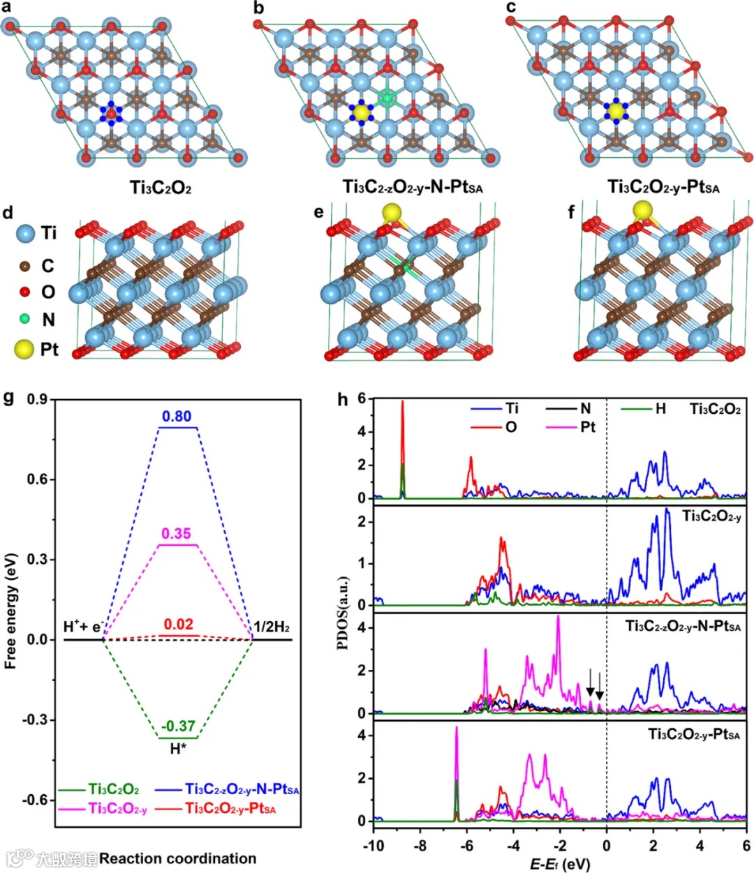 DFT计算表明,Ti₃C₂Tₓ-PtSA在氧空位上锚定的单原子铂提供了接近零吉布斯自由能(ΔG_H≈0),显著优化了氢吸附动力学。此外,投影态密度(PDOS)分析揭示了Pt-H结合的减弱,使得催化过程更高效。
