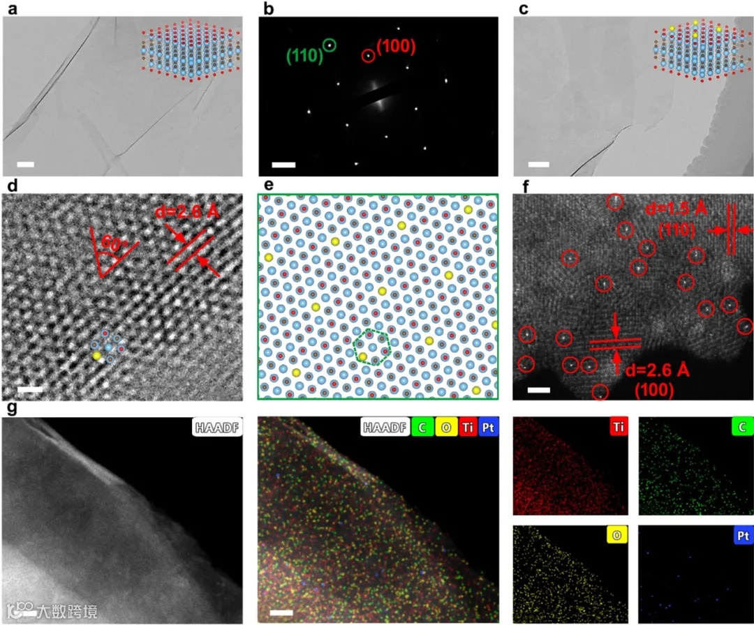 扫描电子显微镜(SEM)、透射电子显微镜(TEM)和HAADF-STEM观察显示,Ti₃C₂Tₓ-PtSA保持了单层结构,且Pt单原子均匀分布在基底表面,进一步证明了快速热冲击方法的可靠性。