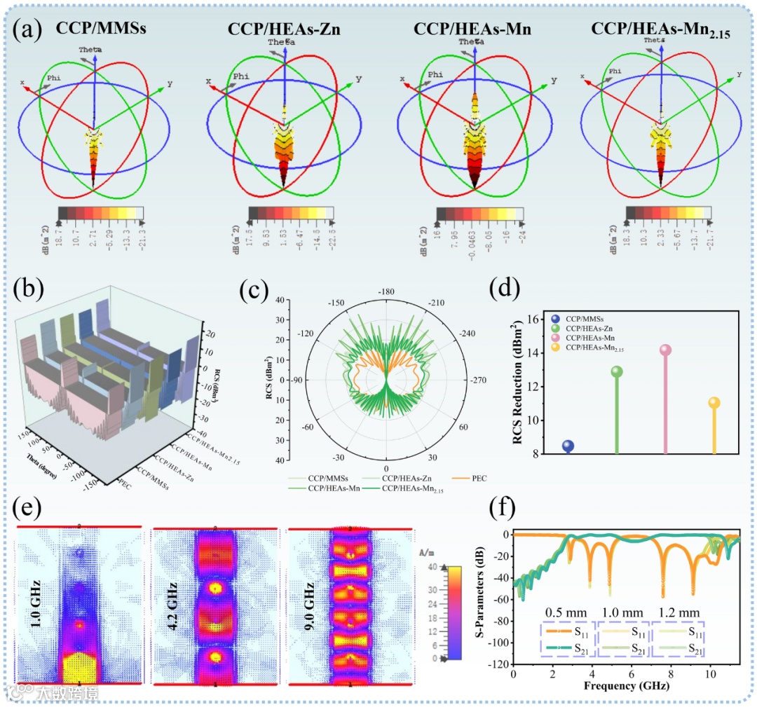 超薄电磁波吸收:CCP/HEAs-Mn2.15样品在仅1.03 mm厚度下实现了-51.35 dB的高效电磁波吸收。