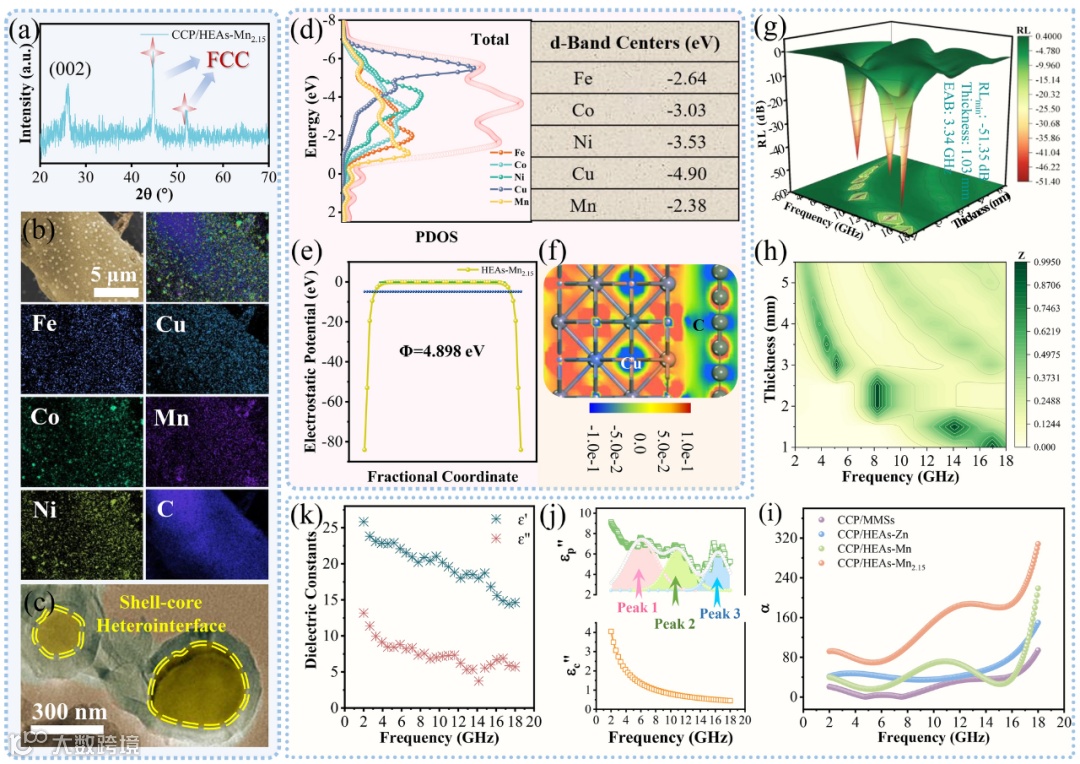 图4:展示了CCP/HEAs-Mn2.15的电磁波吸收性能,表明其优异的介电损耗和结构特征的关联。