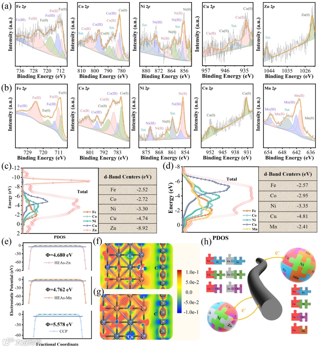图3:展示了XPS光谱与电子迁移模式,揭示金属元素的电子状态与HEAs中等效偶极子的形成机制。