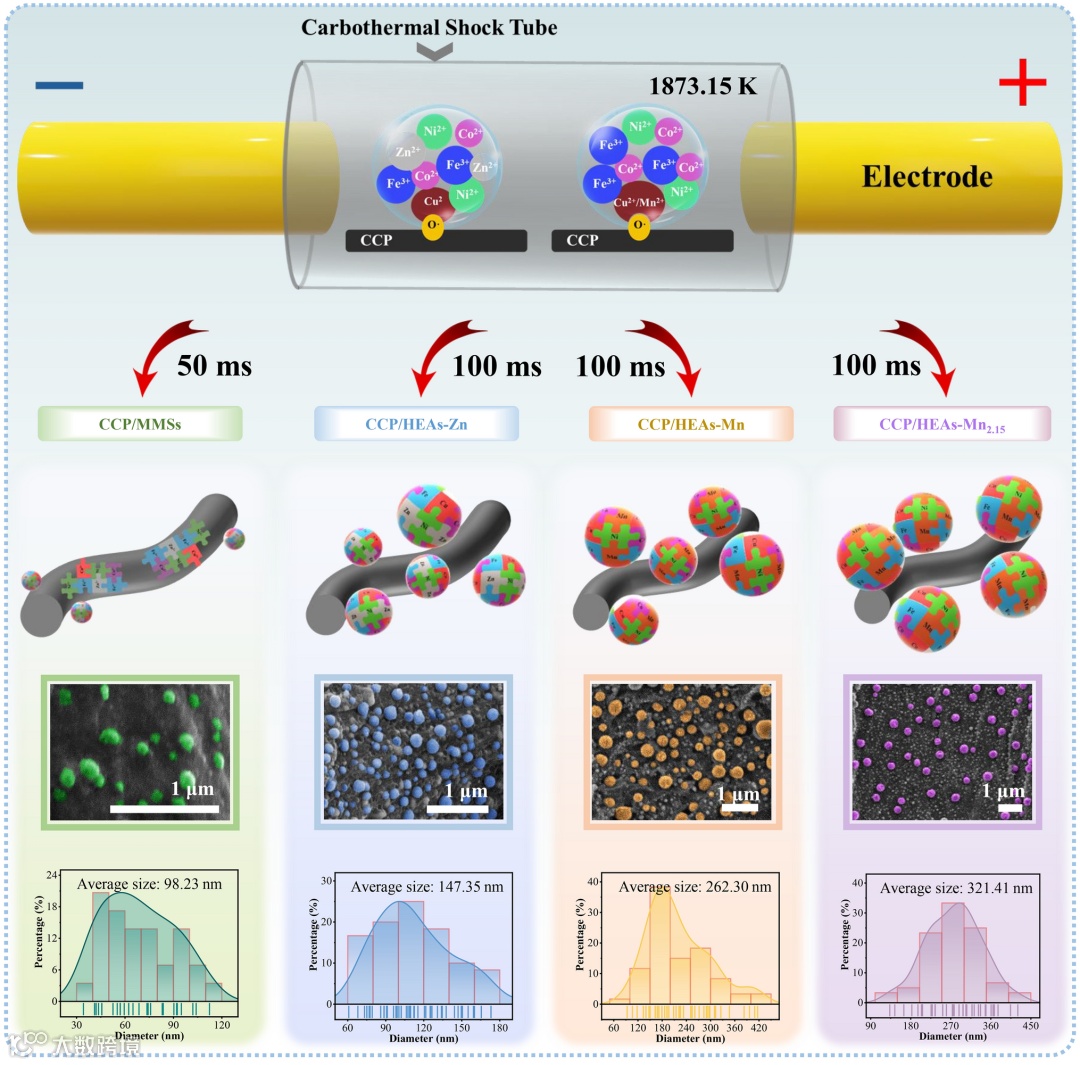 图1:展示了CCP/HEAs复合材料的制备过程及SEM图像,表明随着锰含量的增加,HEAs纳米颗粒逐渐均匀分布。