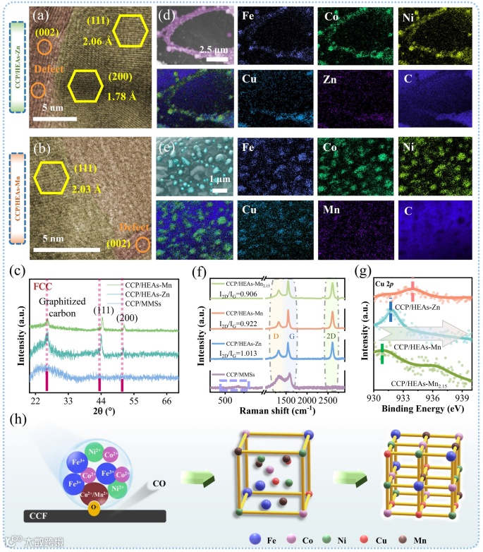 图2:通过HRTEM与XRD分析CCP/HEAs-Zn和CCP/HEAs-Mn的结构特征,确认了其面心立方结构与元素均匀分布。