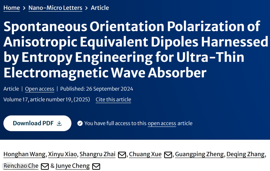 复旦大学车仁超教授、大连理工大学薛闯教授、大连工业大学翟尚儒教授及深圳北理莫斯科大学程俊业副教授等人在《Nano-Micro Letters》上发表了题为“Spontaneous Orientation Polarization of Anisotropic Equivalent Dipoles Harnessed by Entropy Engineering for Ultra-Thin Electromagnetic Wave Absorber”的论文。