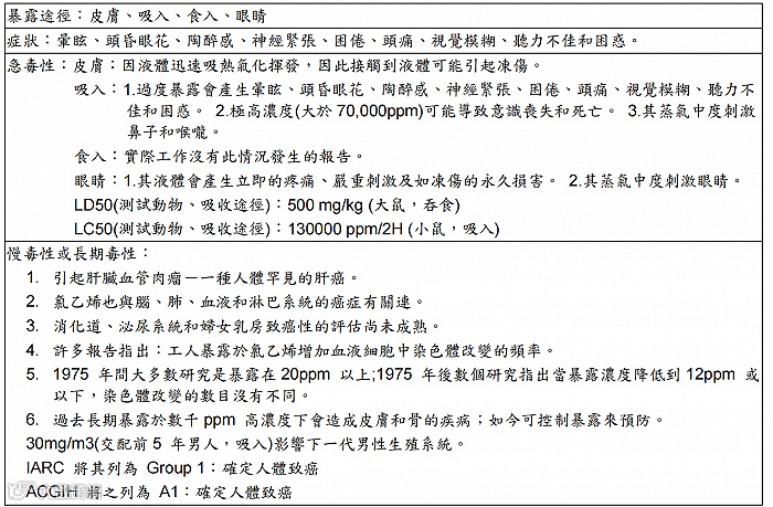 根据台湾氯乙烯工业股份有限公司的安全资料表,人体在暴露于氯乙烯后,会出现昏眩、头昏眼花等症状,慢毒性包括肝癌和脑、肺、血液和淋巴系统的癌症等。