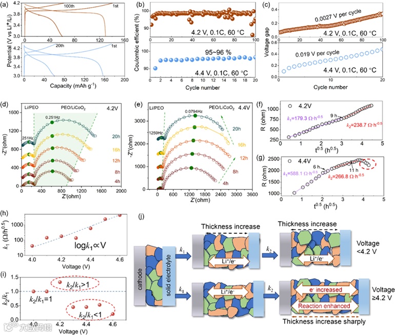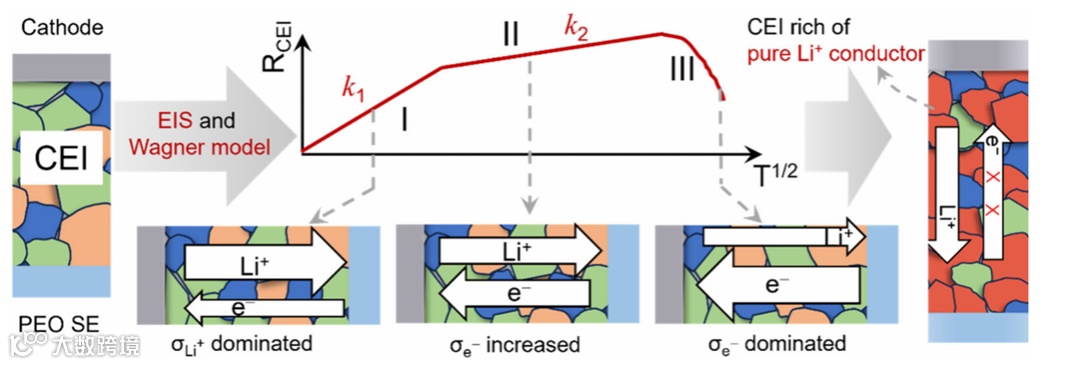 为了解决这一问题,刘继磊团队通过分析PEO与LiCoO2之间的界面反应,使用Wagner模型研究了不同电压下界面电阻的变化。在开路电压≥4.2V时,电池界面发生了从离子导电到电子导电的转变,导致反应动力学加速。研究显示,在4.0V至4.1V之间,界面降解遵循抛物线规律,而在更高电压下,离子导电的主导地位逐渐被电子导电取代。