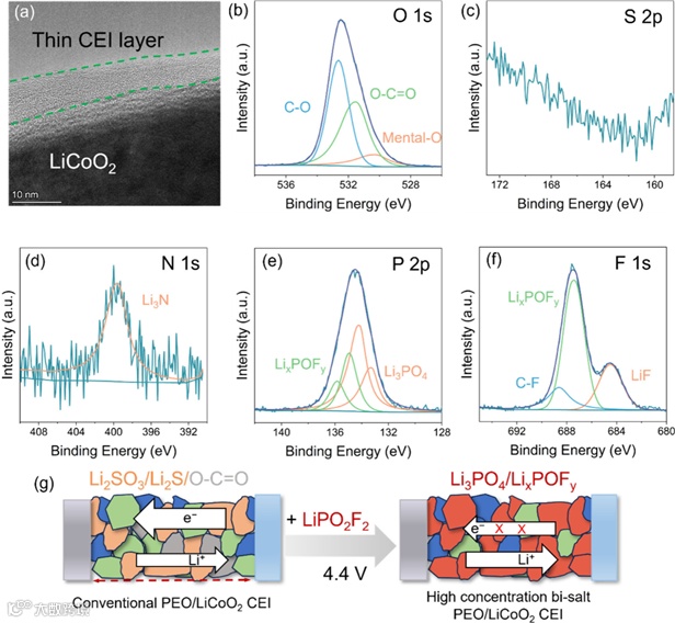 图5:展示了在4.2V和4.4V电压下,使用高浓度双盐PEO固体电解质循环后的ASSLBs形成的CEI层的结构和组成。图中包括了TEM图像以及O 1s、S 2p、N 1s、P 2p、F 1s等XPS图谱,清晰呈现了不同电压下CEI层的变化与电池性能的关系。
