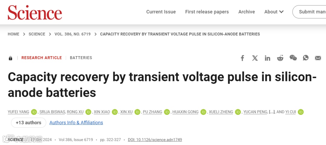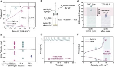 美国斯坦福大学崔屹教授团队在Science发表了题为“Capacity recovery by transient voltage pulse in silicon-anode batteries”的论文,报道开发了一种方法来大幅回收硅电极中的孤立活性材料,并使用电压脉冲将孤立的锂硅(LixSi)颗粒重新连接到导电网络。