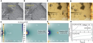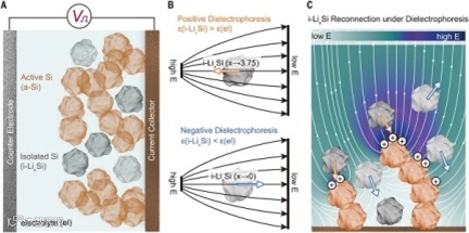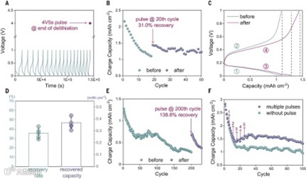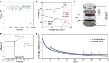研究人员使用5秒的脉冲在锂硅和硅-磷酸铁锂(Si-LFP)电池中实现了超过30%的容量恢复。恢复的容量通过多个脉冲维持和复制,提供了恒定的容量优势。本研究验证了恢复机制是中性孤立LixSi粒子在局部非均匀电场下的运动,这种现象被称为介电电泳。