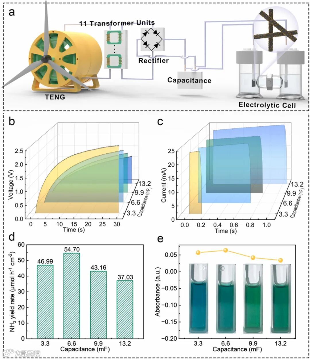图5展示了自供电硝酸盐还原反应(NO₃RR)系统的整体设计和性能。图5a为系统的示意图,由3DP-TENG、控制电路和电化学反应池组成。图5d和5e展示了在不同电容值条件下,系统的氨产率和吸光度变化,最终在6.6 mF的电容条件下,氨产率达到最高值54.70 μmol h⁻¹ cm⁻²。
