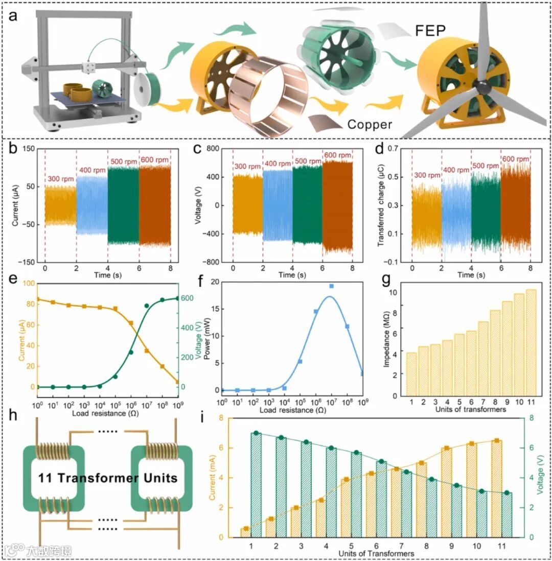 图4展示了3D打印的摩擦电纳米发电机(3DP-TENG)的设计和性能。图4a为3DP-TENG的结构示意图,由内转子和两个对称的外定子组成,全部由聚乳酸(PLA)制成。图4b-d展示了3DP-TENG在不同转速下的输出特性,包括短路电流、开路电压和转移电荷。