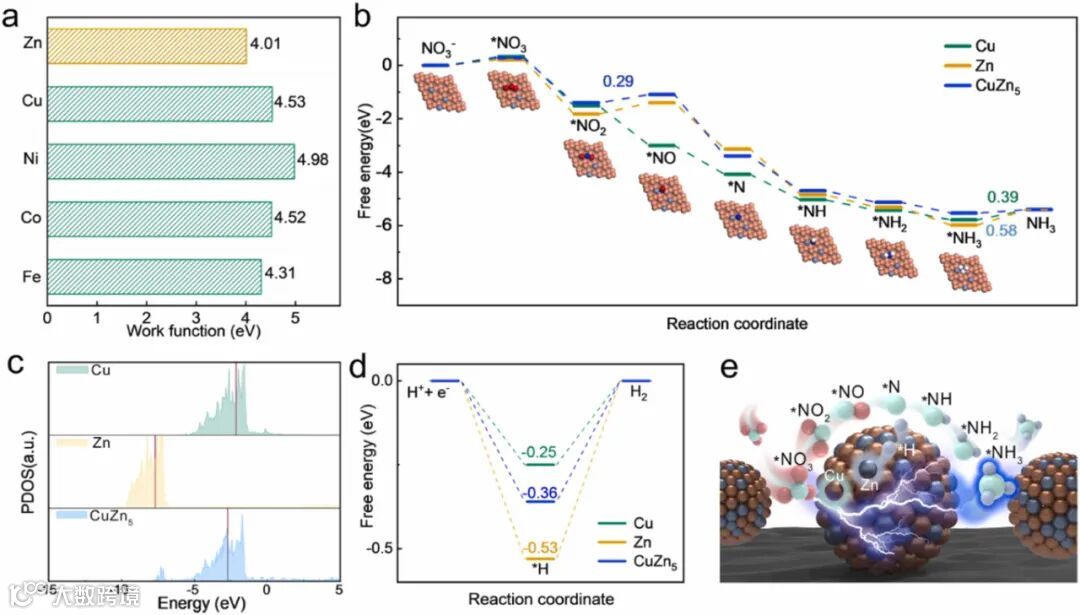图1展示了铜锌(CuZn)合金在硝酸盐还原反应(NO₃RR)中的理论研究结果。图1a比较了不同金属的功函数,发现锌的功函数最低,意味着它在抑制析氢反应(HER)的同时,能够为NO₃RR提供更多活性氢(H)。图1b展示了CuZn₅合金的吉布斯自由能变化,表明该合金能够降低反应中间体的吸附能垒。图1c进一步揭示了CuZn₅合金通过优化铜的d带中心位置,增强了对反应中间体的吸附能力。图1d显示,与纯铜相比,CuZn₅合金显著降低了H的吸附自由能(ΔGH),从而抑制了HER的发生。