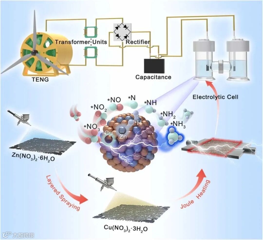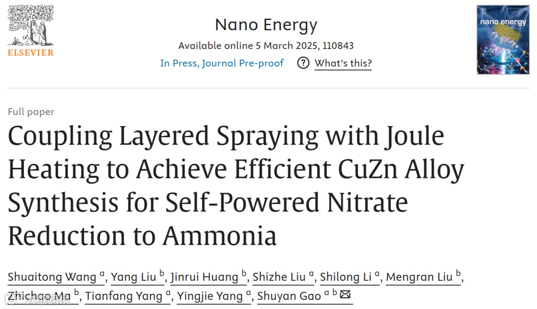 氨(NH₃)作为一种重要的工业化学品和潜在的清洁能源载体,在多个领域有着广泛应用。然而,传统的哈伯-博施法合成氨过程能耗高、碳排放量大。电化学硝酸盐还原反应(NO₃RR)作为一种新兴的绿色合成氨技术,受到广泛关注。河南师范大学高书燕教授团队在《Nano Energy》期刊上发表了题为“Coupling Layered Spraying with Joule Heating to Achieve Efficient CuZn Alloy Synthesis for Self-Powered Nitrate Reduction to Ammonia”的研究论文(2025年3月5日)。该研究通过分层喷涂结合焦耳热处理的方法,制备了CuZn₅合金催化剂,显著提高了NO₃RR过程中的氨合成效率,为绿色合成氨技术的发展提供了新的思路。