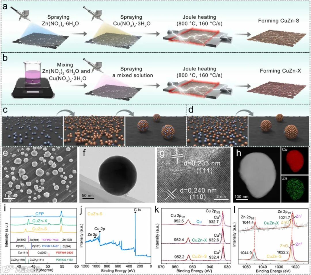 图2详细介绍了CuZn合金催化剂的制备过程及其结构表征。图2a展示了基于分层喷涂和焦耳热处理的CuZn合金(CuZn-S)的合成方法。图2e和2f通过扫描电子显微镜(SEM)和透射电子显微镜(TEM)展示了CuZn-S的球形纳米结构,平均粒径约为311纳米,且分布均匀。图2g的高分辨透射电子显微镜(HRTEM)图像进一步确认了CuZn₅合金的晶格条纹。