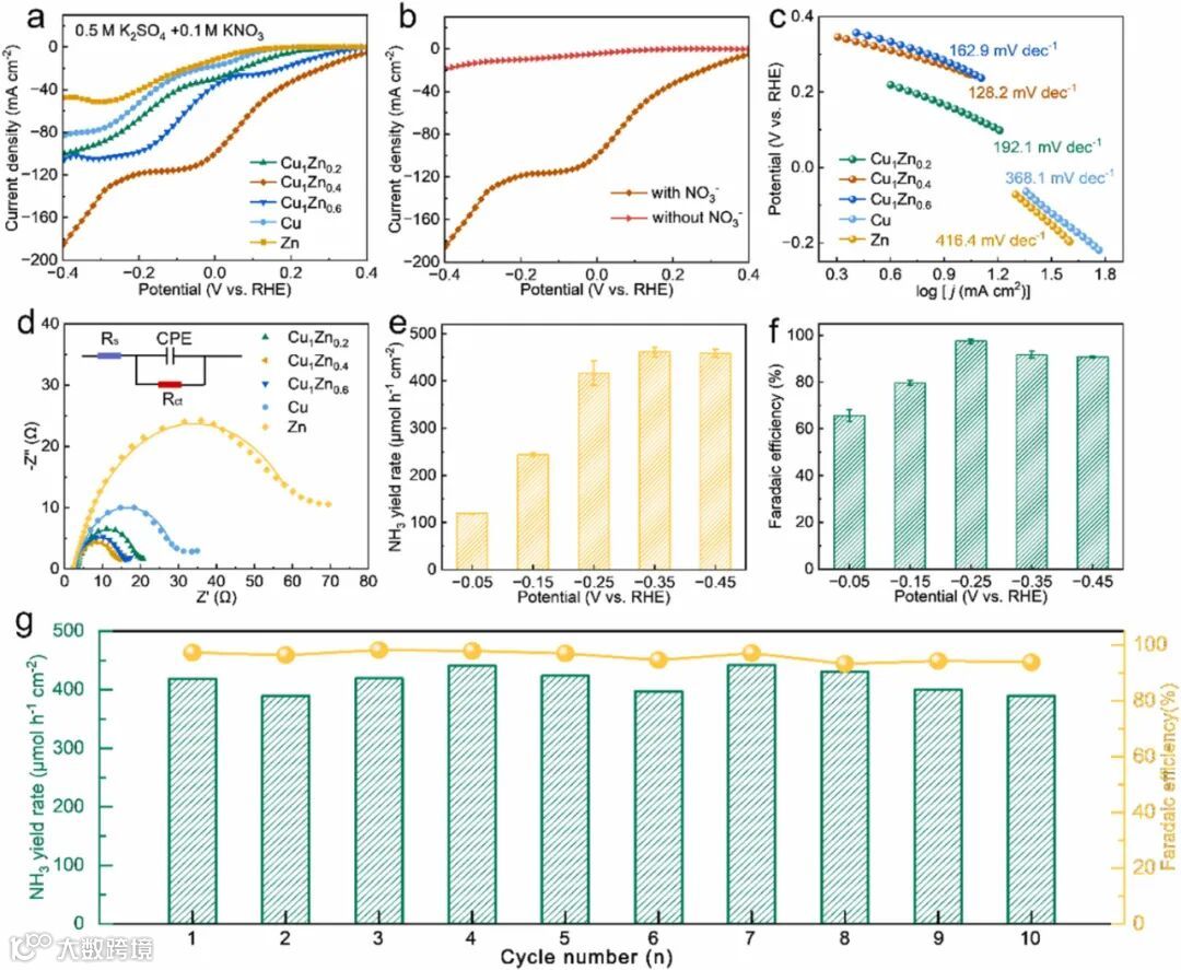 卓越的催化性能:所制备的CuZn₅合金催化剂在0.5 M K₂SO₄和0.1 M KNO₃溶液中表现出卓越的性能,氨的法拉第效率高达98.4%,产率达到420 μmol h⁻¹ cm⁻²。