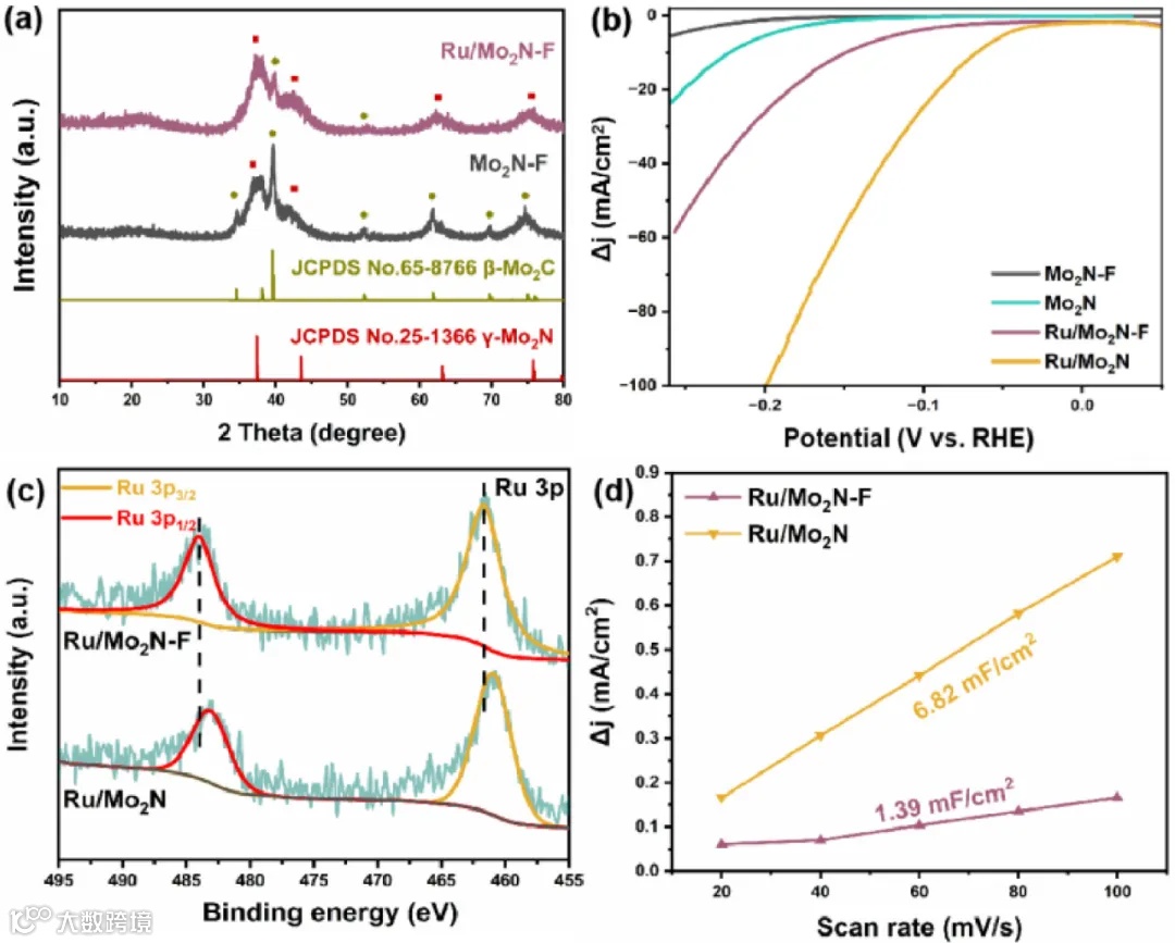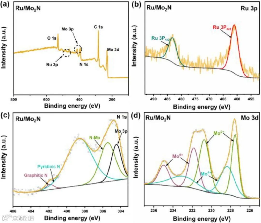图2 展示了Ru/Mo2N的XPS光谱,包括全谱和Ru 3p、N 1s、Mo 3d的高分辨率光谱。XPS分析揭示了Ru、Mo和N的价态,以及它们在Ru/Mo2N表面的化学状态和组成。