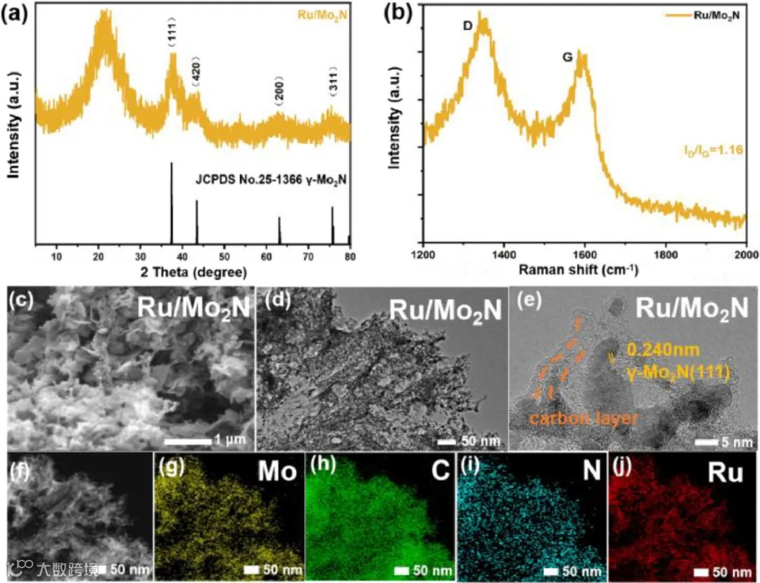 图1 展示了Ru/Mo2N的XRD图谱、拉曼光谱、SEM图像、TEM图像、HR-TEM图像以及EDS映射图像。XRD图谱证实了Mo2N的立方相γ-Mo2N的形成,而拉曼光谱显示了非晶态碳的存在。SEM和TEM图像揭示了Ru/Mo2N的卷曲纳米片结构,具有开放和连续的通道,这些通道可能来源于分解的三聚氰胺和氰尿酸,预期会增强活性位点的可及性。HR-TEM图像和EDS映射进一步证实了Mo、C、N和Ru在Ru/Mo2N中的均匀分散。