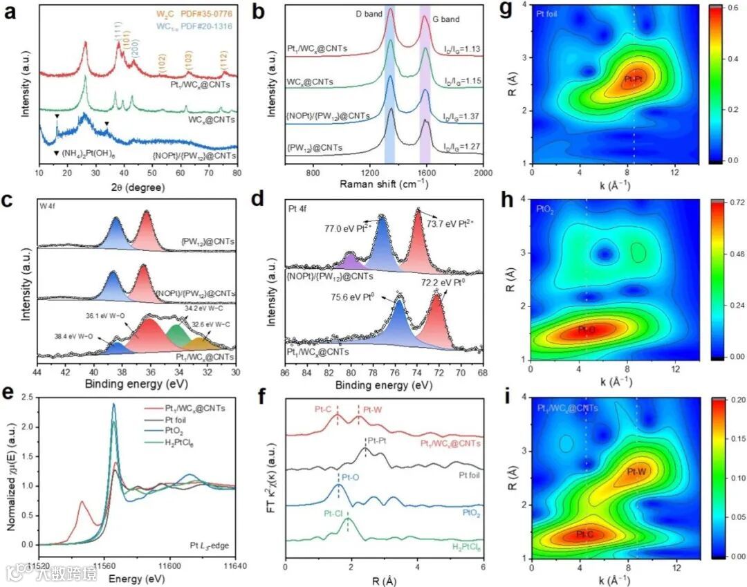 XRD、拉曼光谱和XPS分析揭示了Pt1/WCx@CNTs的结构特征和电子环境。特别是通过XPS和EXAFS分析,证实了Pt原子被锚定在WCx载体中,形成单原子催化剂。