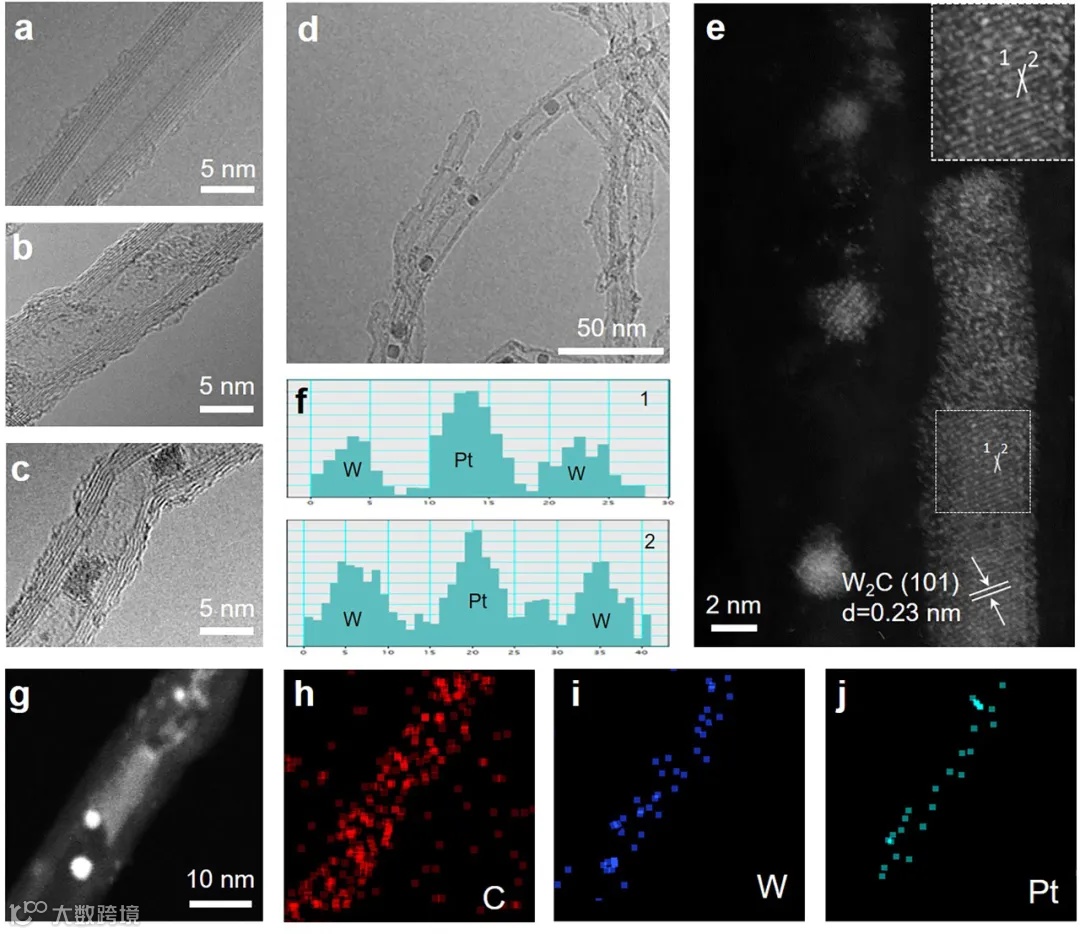 通过SEM和HRTEM显微镜成像,展示了Pt1/WCx@CNTs的形貌特征。图中可以看到碳纳米管的直径和单层结构,以及Pt1/WCx的纳米粒子在管腔内的分布。