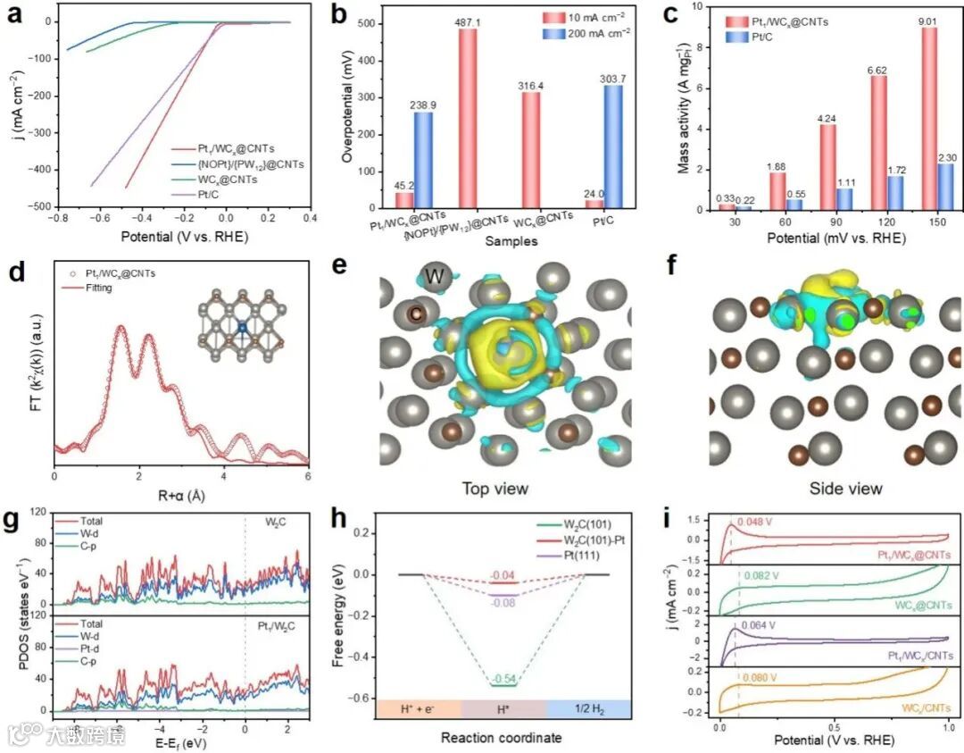 图4展示了Pt1/WCx@CNTs在酸性环境中的电化学性能,包括其在不同电流密度下的过电位表现和与传统Pt/C催化剂的对比。Pt1/WCx@CNTs表现出显著的性能优势。
