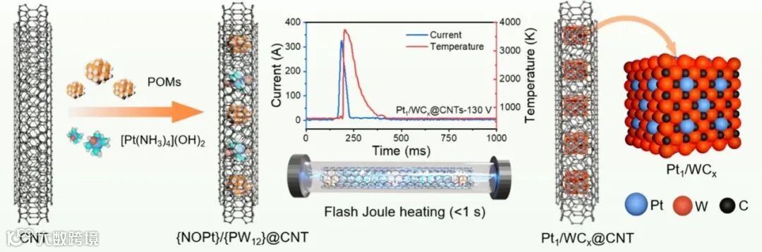 该图展示了如何通过CFJH技术将Pt原子锚定在WCx纳米结构中,并将其封装在碳纳米管内的过程。图示过程包括催化剂前驱体的组装和随后进行的碳热还原反应,极大提升了催化剂的效率与稳定性。
