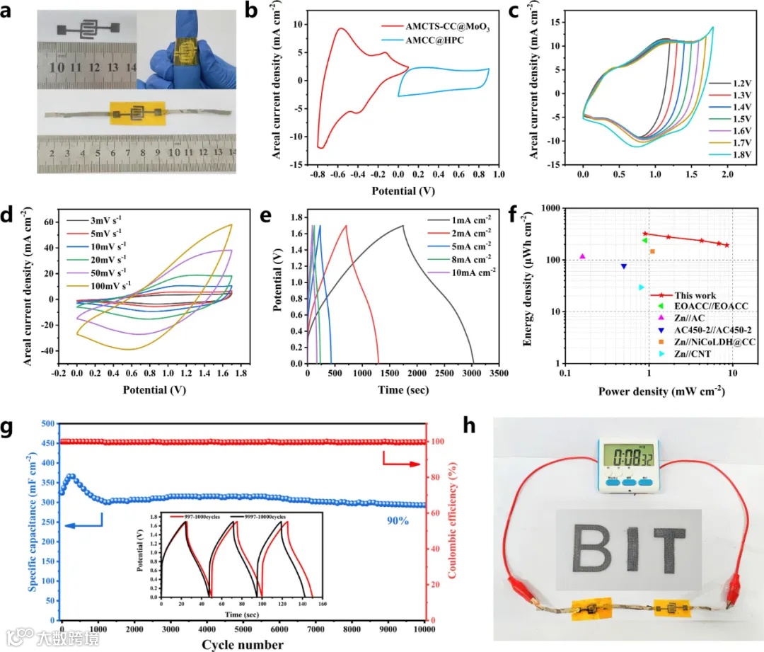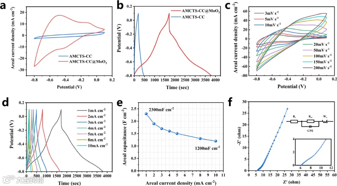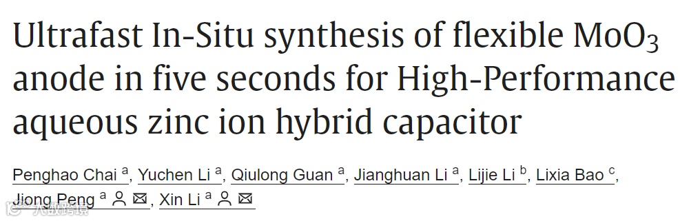 卓越的电化学表现:制备的α-MoO₃/碳布负极比电容达2300 mF/cm²,展现出优异的循环稳定性和倍率性能。 -
