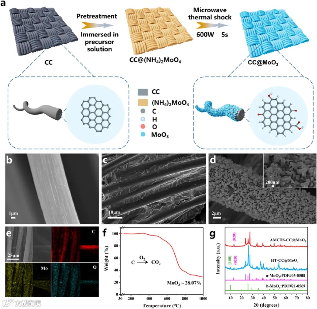 空气辅助微波碳热冲击合成:研究团队设计了一种全新的微波碳热冲击法,使α-MoO₃在碳布上迅速形成,仅需5秒完成反应。 -